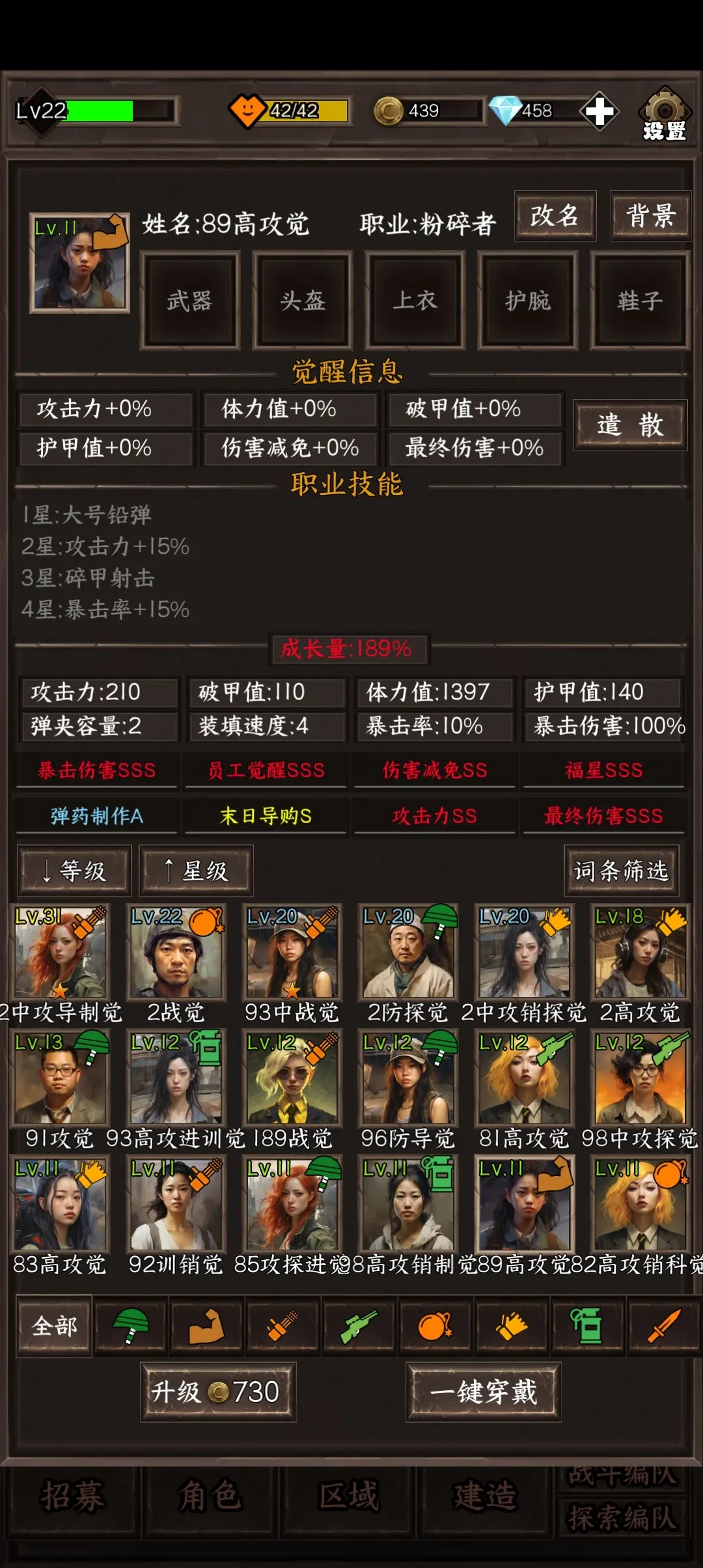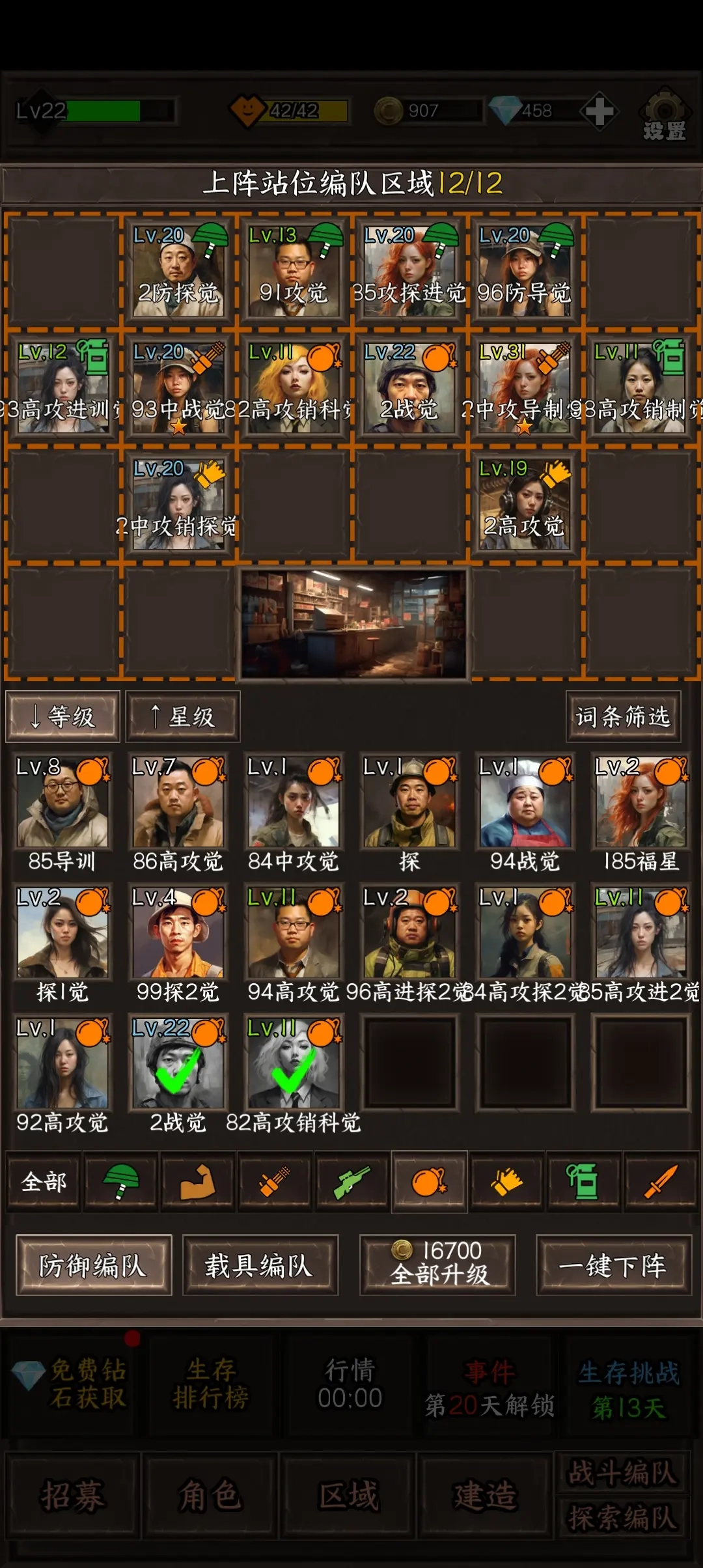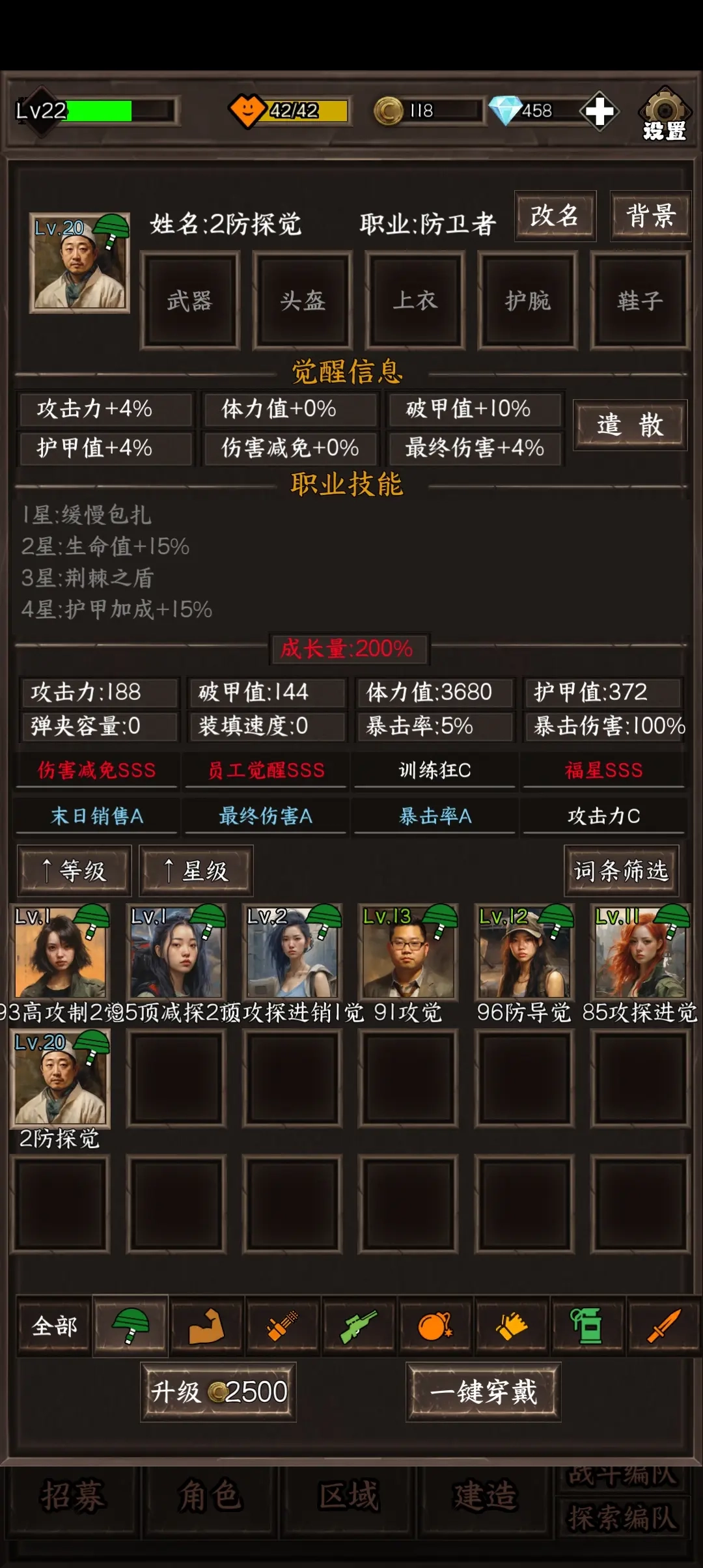 阵容搭配方面,推荐采用4名防御型角色、2名输出型角色、2名干扰型角色、2名投掷型角色以及2名支援型角色的组合。若有需要,干扰和投掷角色可替换为输出角色,但支援角色需至少保留。资源充足时可组建两支队伍,资源有限则集中培养一支队伍;若关卡难以通过,可通过探索区域补充资源,当危险度达到100%时,使用载具队伍进行战斗。销售、导购、进货、科研、训练这五个职业的词条,每个职业需各凑齐5个,以此来提升角色的星级与等级,获取职业经验并获得额外加成效果。