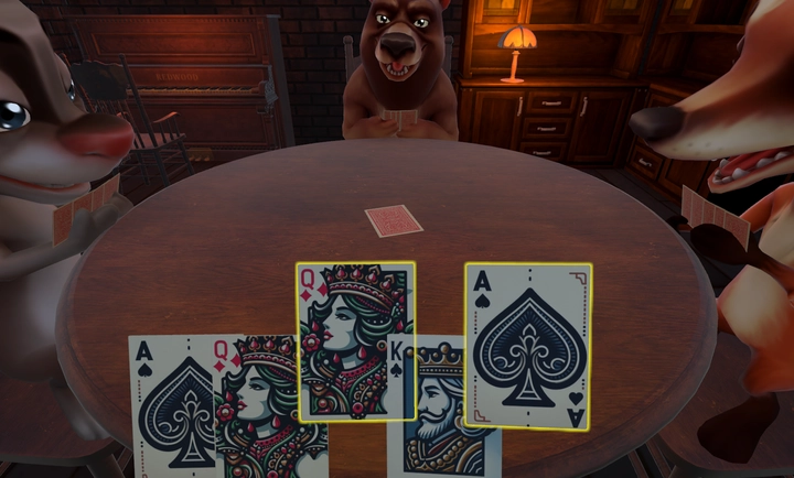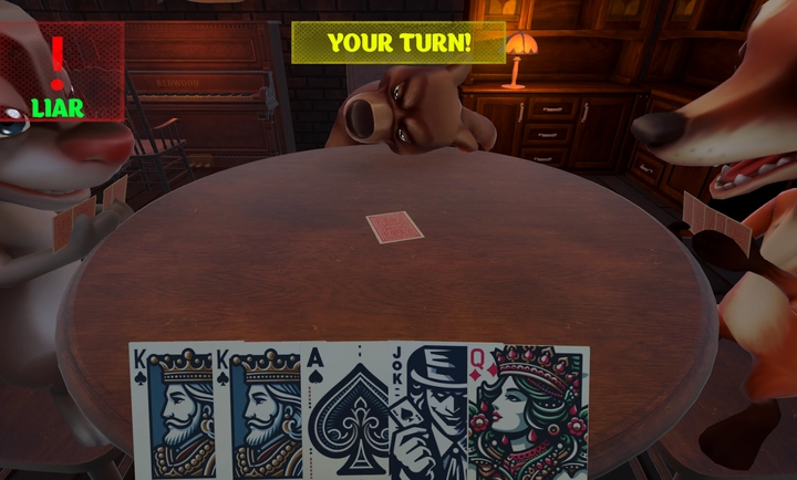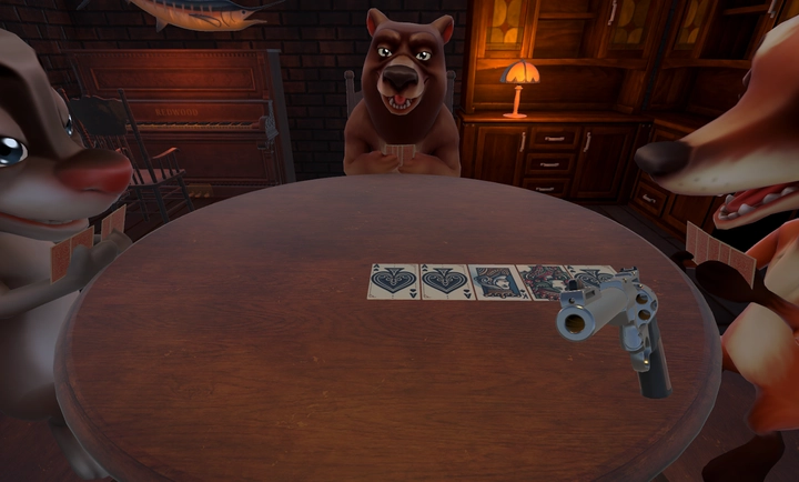 判断规则:若上家打出的牌并非开局时亮出的“目标牌”,那么被开牌的玩家就得用“左轮手枪”对自己进行一次虚拟的“开枪”操作(游戏内为虚拟行为,不存在实际伤害);反之,下家则需要用“左轮手枪”对自己开一枪。