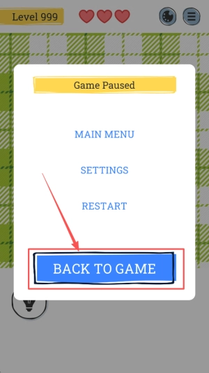 暂停菜单:在Level 999 Game Paused界面点击BACK TO GAME即可继续游戏。