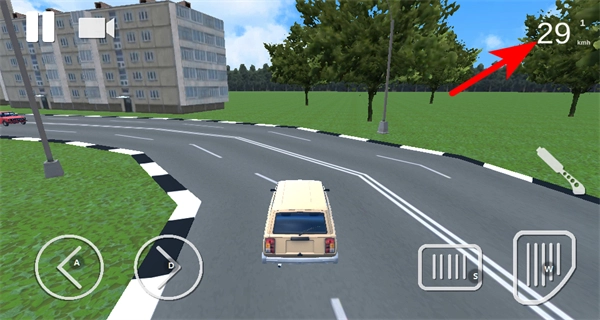 进入驾驶界面后,我们可以借助油门键来操控车辆,右上角会显示当前的车速,比如29km/h,还能自由调整方向和油门,以此来控制车辆的行驶状态。
