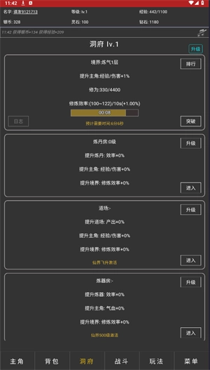 玩家能够通过点击洞府查看自身的修炼进展,当自身的境界修为积累到特定阶段时,就可以着手进行突破。