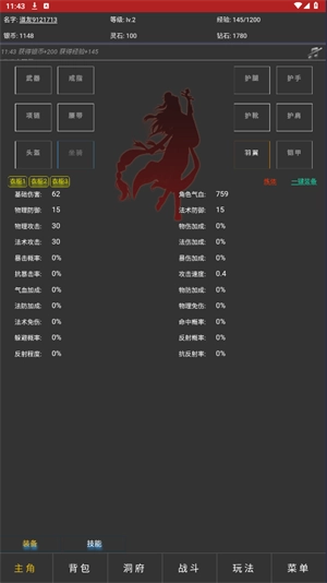 在主角界面中,玩家能够查看角色的各项基础属性,同时也可以为角色穿戴已经获取到的装备。
