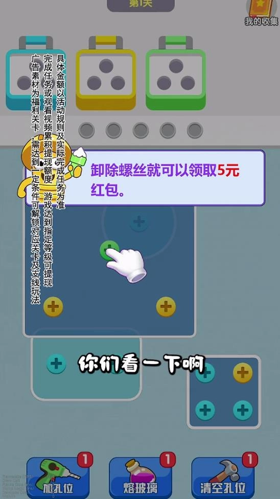 这是一款以消除螺丝为核心玩法的游戏,玩家通过消除螺丝来获取红包奖励。游戏内有大量待消除的螺丝,还有丰富的红包福利等待玩家闯关解锁。你需要消除相同颜色的螺丝来完成关卡挑战,消除越多螺丝,就能领取更多专属红包奖励。