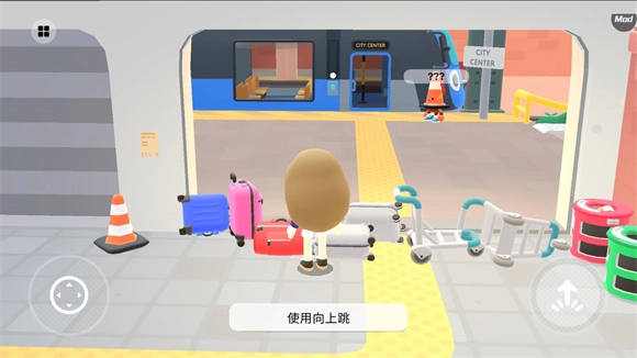 游戏界面左侧的摇杆负责控制移动,右侧的按键用来操控跳跃,玩家需要前往楼下的大厅,进入大厅内的列车就能前往小镇。