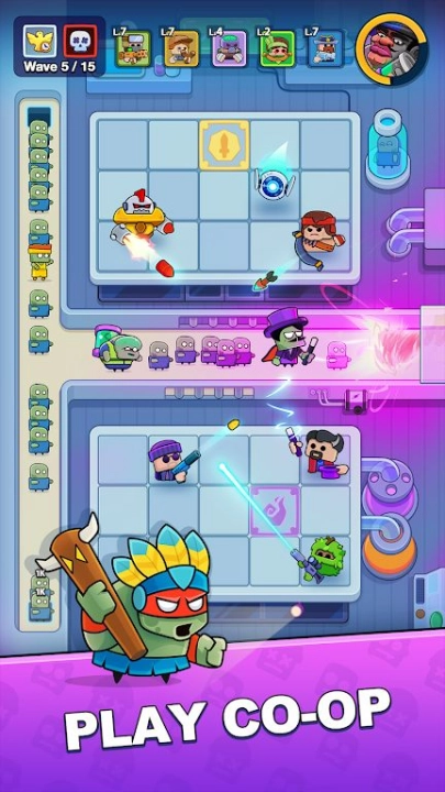1、策略塔防与养成玩法融合:这款采用Q版画风的策略塔防游戏,玩家可通过召唤和强化英雄,在关卡里搭建防线来抵挡僵尸的进攻。