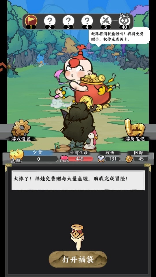 1、进入游戏,点击打开福袋领取初始盘缠,开始闯关