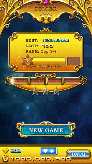 3、当相同颜色的钻石匹配数量达到5个时,会生成一颗星钻,点击星钻后,其周围所有的钻石都会被消除,目前游戏关卡已进行到245关。