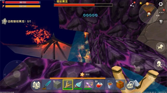 3、进入龙心后直接前往龙巢底部,找准时机借助石块垫高进入龙巢,再用石块将自己固定在水柱下方。记得吃氧气豆避免溺水,喝西瓜汁增加防火效果。此时熔岩黑龙会喷射岩浆,岩浆碰到水会在你周围形成黑曜石和石头构成的堡垒,用钻石镐凿开一个孔,就能用远程武器进行反击了。
