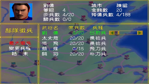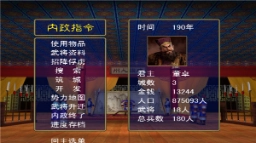 5、游戏初始提供5个年代可供选择,分别为:黄巾之乱、讨伐董卓、群雄割据、赤壁之战、三国鼎立。无论选择哪个年代,游戏都会在公元280年结束。其中黄巾之乱始于公元185年,这意味着选择该年代的玩家需要在95年的时间内完成统一全中国的目标,否则便视为失败。游戏开始时需挑选一位君主来实现统一中原的霸业,若选择董卓,其麾下兵强马壮,且有吕布辅佐,难度最低;选择刘备的话,开局时会面临四面受敌的困境,难度较大;选择曹操的难度则介于董卓与刘备之间,相对适中。