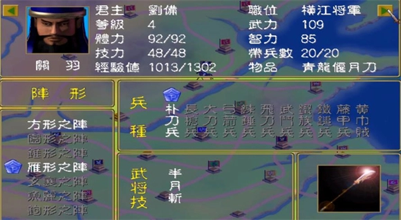 6、游戏中每位武将的武将技各有差异,其种类数量由先天属性决定,后天训练也至关重要。游戏初始阶段,每个武将都具备一种必杀技,例如张飞的鬼戟、关羽的半月斩。后续几乎每打赢一场战役就能提升一级,当等级达到10级和20级时会进行转职,此时有3种职位可供挑选。不同职位对应的必杀技各不相同,威力自然也各有高低。部分必杀技能为自身补充体力值,有些能歼灭敌方大量小兵,还有的可对敌方武将造成沉重打击。武将必杀技的威力强弱往往会影响一场战争的最终结果,所以如何进行转职是游戏里颇为关键的一项内容。武将技除了常见的针对武将和士兵的类型外,还包含诸多特殊技能,像补血、埋伏、封印等。