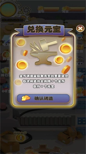 2、元宝是游戏里至关重要的道具,消耗金币能够铸造元宝,元宝作为造梦工厂的核心道具,既可以提现、赠送,也能用来购买工厂中的工人和增益地图。