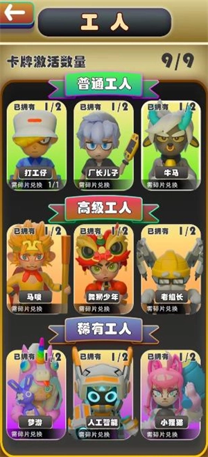 3、工人是游戏内的角色,游戏中有多种不同类型的工人,每种工人每日产出的金币数量存在差异。工人等级划分为普通、高级、稀有三类,并且同一角色对每种等级的工人最多只能持有两个。收集齐工人碎片就能激活该工人,激活后点击招工按钮即可完成招聘。