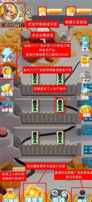 进入游戏后,点击头像完成实名认证,认证成功后会获得一名普通工人。每天观看六次广告可增加工厂电力,以此维持工厂机器和工人的正常运转,工厂每天会持续产生金币。