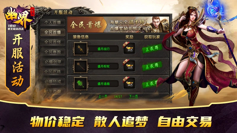 2、上线即可免费领取英雄,还能免费学习合击技能,操作简单易懂,游戏内物价稳定。