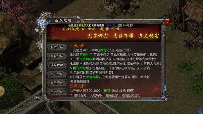2、新区活动及打怪掉落大量充值卷,可兑换元宝。