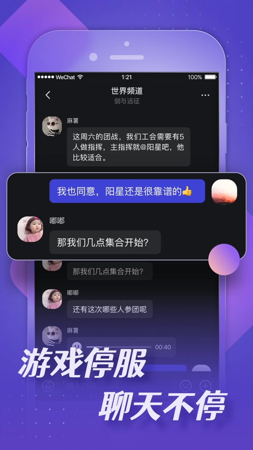 1、这是一款面向玩家的社交聊天应用,玩家既能通过它获取最新的游戏资讯,也能和身边的队友聚集到一起。
