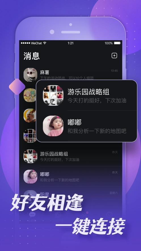 2、打造一站式便捷的在线交友工具,您可以随时随地通过网络聊天,也能组建团队开启语音或视频互动。
