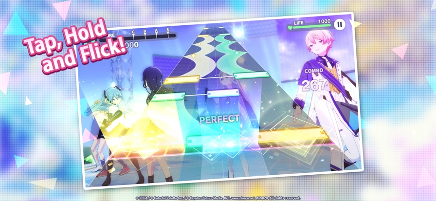 游戏内的音符类型共有四种,分别对应点击、轻扫、长按与跟随操作;其中黄色音符属于关键音符,其得分高于普通音符。歌曲的判定等级同样分为四类,按得分从高到低依次为PERFECT、GREAT、GOOD、BAD;若未达成上述任意一种判定,则会显示MISS。需要注意的是,GOOD及更低等级的判定会中断COMBO(连击),而BAD与MISS判定还会扣除自身生命值,当生命值降至0时,得分将出现大幅衰减。