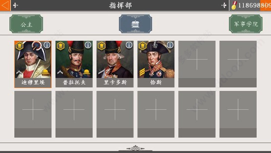 1、点击进入指挥部后,你会看到界面上有几个空槽,这些空槽用于显示你当前拥有的将领;若想查看将领详情,点击右上角的“军事学院”即可。