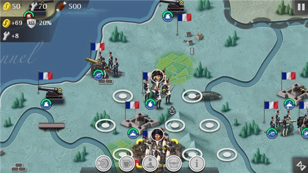 游戏里用不同颜色来划分各个疆域,军力每次行动都有特定的移动范围,玩家能够充分利用这个范围进行最大程度的移动,以此快速拓展自己的疆域。通常情况下,可以借助民兵这类较弱的兵种来完成疆域拓展的任务。