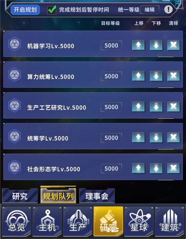 感谢羁池鱼大佬的指点。具体用法参照图示,按顺序排列这十项研究就行。开局先利用研究的自动晋升功能,把等级设为800,等升到四大类的最后一项后,就切换成规划队列模式,通过反复调整统一等级的方法来实现自动化操作。