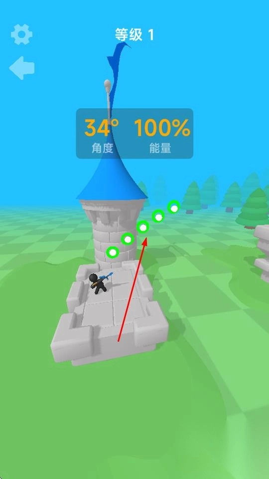 1、调整“角度(34°)”与“能量(100%)”这两个参数,随后点击发射按钮,操控火柴人进行射击,以击败目标。