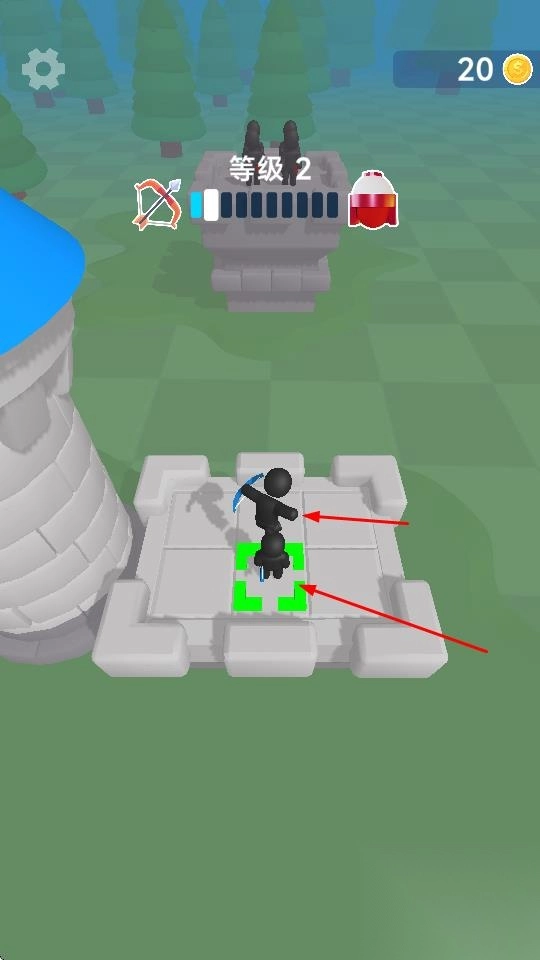 2、操控火柴人移动,夺取城堡,在绿色方格上停留即可升级(升至2级),以此增强战斗力与防御能力。