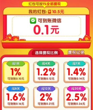 4、攒下的红包都能按百分比兑换获取,兑换比例还能通过闯关来提升呢!