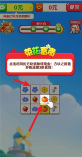 荣华富贵赚钱游戏是一款玩法简单有趣、容易上手的休闲消除类游戏。游戏内有许多不同花纹的花朵,你只需将相同图案的花朵连成一条线,它们便会消除。成功消除所有方块即可过关并领取红包奖励,段位越高,能获得的红包奖励就越丰厚!