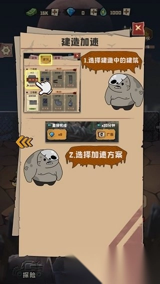 4. 同理,点击“建造”按钮,选择所需建筑后点击购买。若想对建造过程进行加速,可选中正在建造的建筑,然后选择对应的加速方案即可!
