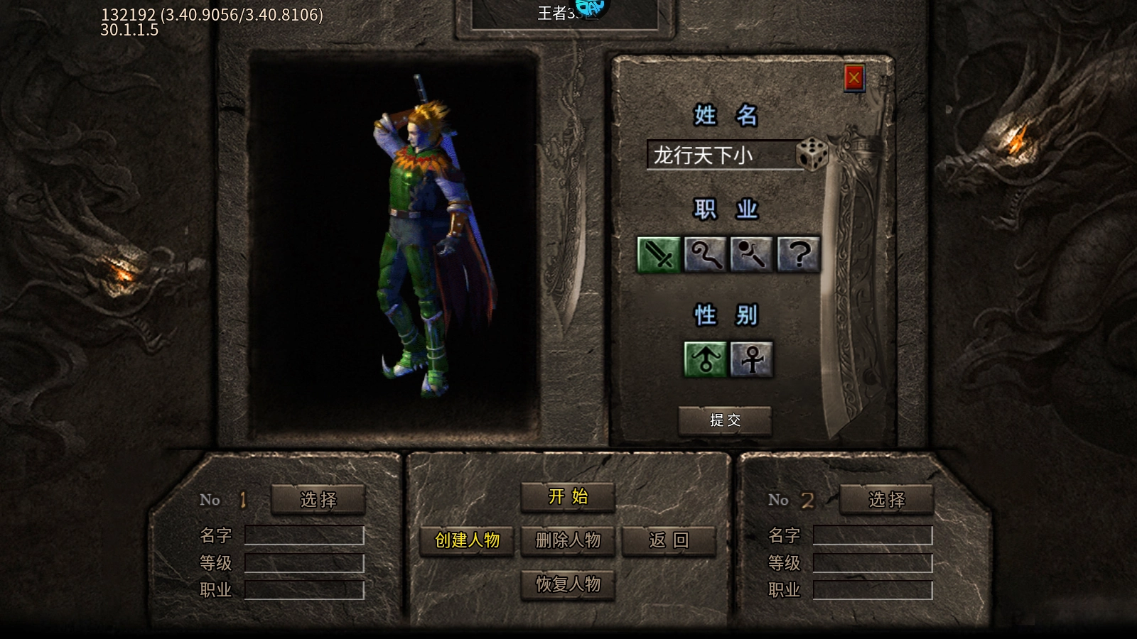 3、玩家首次进入游戏时,会弹出职业设置界面;若已有角色,该角色会显示在下方并呈现各类详细信息。由于这个账号是新号,下方区域为空,玩家只需确定好名字并点击提交按钮即可。