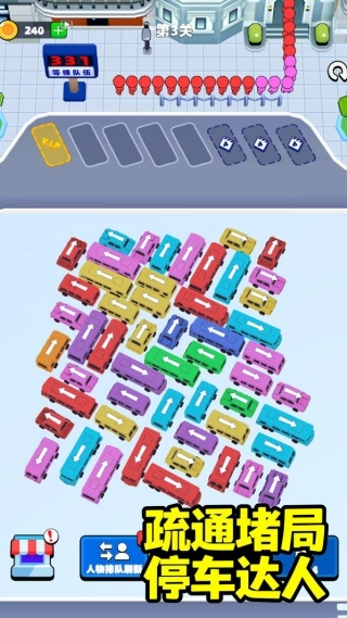 《神级倒车》是一款以停车场调度为核心的休闲益智游戏,主打策略性十足的脑力挑战。当玩家置身于车辆密集、布局复杂的停车场场景时,需要通过点击操作,控制车辆沿着车头所指的方向直线移动。借助场地内有限的空隙,巧妙规划各车辆的移动顺序与时机,为被困在深处的目标车辆开辟出一条畅通无阻的出口路径,最终让所有车辆都能有条不紊地驶出停车场,尽情享受逻辑思维带来的强烈满足感。