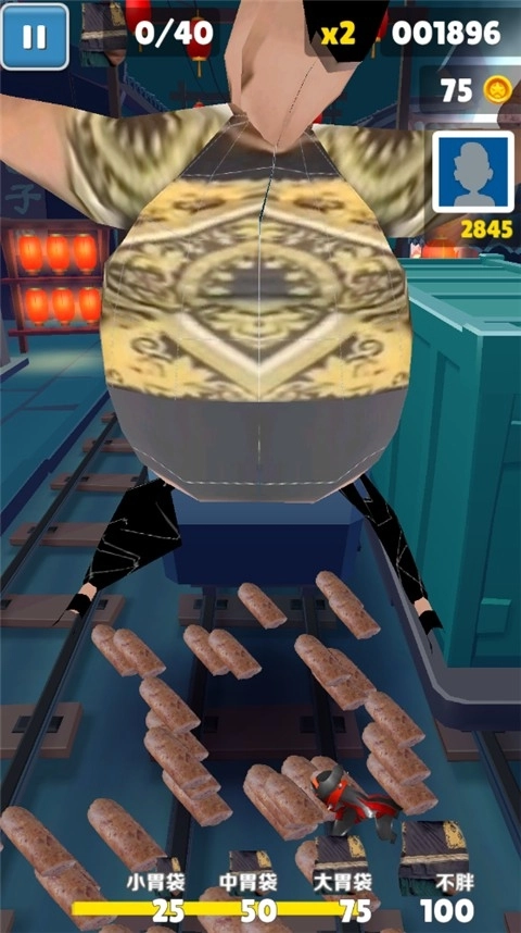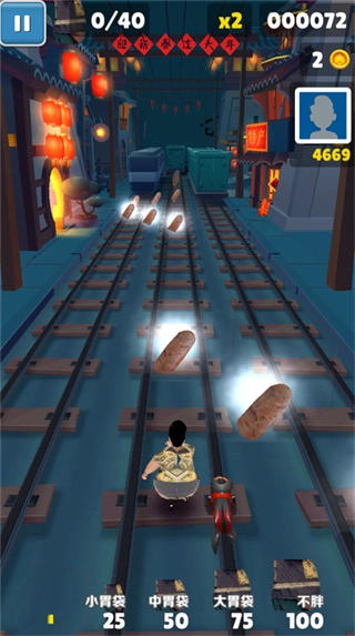 在跑酷时收集香肠,角色的体积会慢慢变大;当体积达到特定标准后,就能激活无敌特效,在短时间内不受任何障碍物影响,继续向前奔跑。