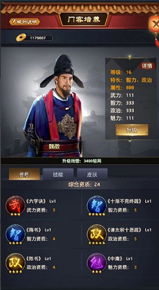 5、门客技能的提升很关键,不同技能在升级后,玩家在关卡中与boss对战时,效果会特别显著。因此,提升门客技能是十分重要的!