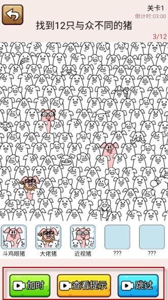 2、每一关都设计了独特的玩法,像第一关的挑战就是找出12只不一样的猪。