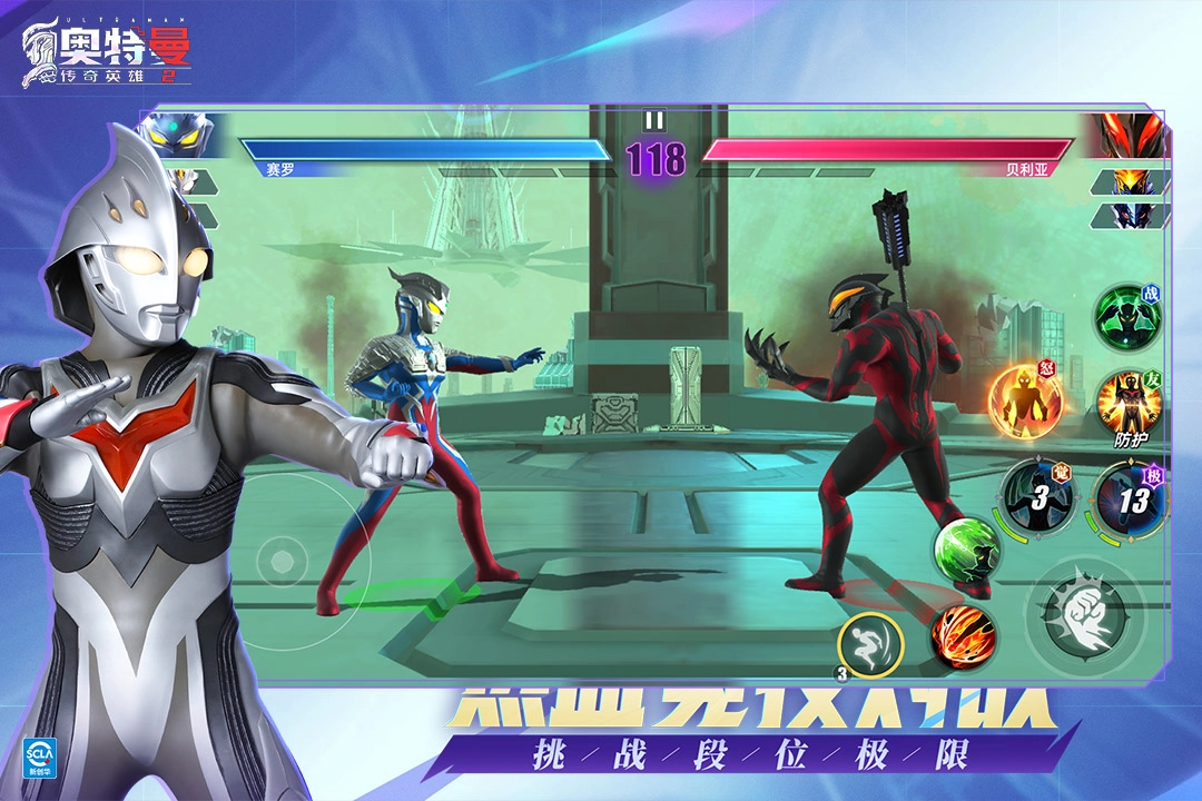 2、玩家能够操控自己培养的奥特曼,与其他玩家进行实时对战,排名赛的奖励包含稀有技能碎片和限定皮肤;