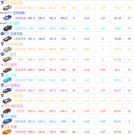 T3:魅影王爵、帝王、月光女神这类免费A车以及更早推出的钻石A车 T3级别的赛车在当前游戏里的使用人数其实相当少,而且严格来讲,裂空的强度还要再低一个档次——毕竟和帝王、月光女神这两辆免费车比起来,它的属性表现更逊色。