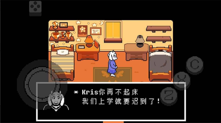 4、接下来便正式进入游戏环节,托丽尔呼唤着克里斯(Kris)的名字,叮嘱他上学别迟到了(按“乙”键推进剧情)。玩家需要操控Kris起床并前往学校:滑动左侧的控件,引导Kris走到箭头所指的位置,之后场景就会自动切换。