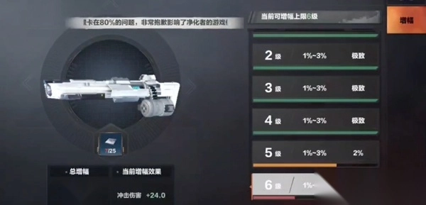 1至4级使用同一种增幅纸,五级及以上则换用另一种。所有装备都能进行强化,且强化成功率为百分之百,但强化效果存在阶段差异(加成幅度在1%到3%之间);若对当前阶段的强化效果不满意,可再次对装备进行强化操作。例如,强化主武器时,若仅增幅到30%,那么剩余的70%增幅进度需通过再次强化来完成,直至达到百分之百的增幅程度。武器设有耐久度属性,但支持无限次数的维修。