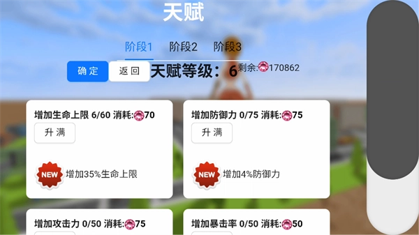 游戏内设有角色天赋系统,包含天赋加点选择界面。玩家可消耗宝石来强化角色的天赋属性,而宝石需通过完成游戏关卡来获取。