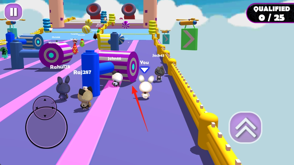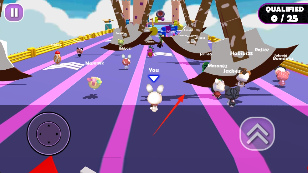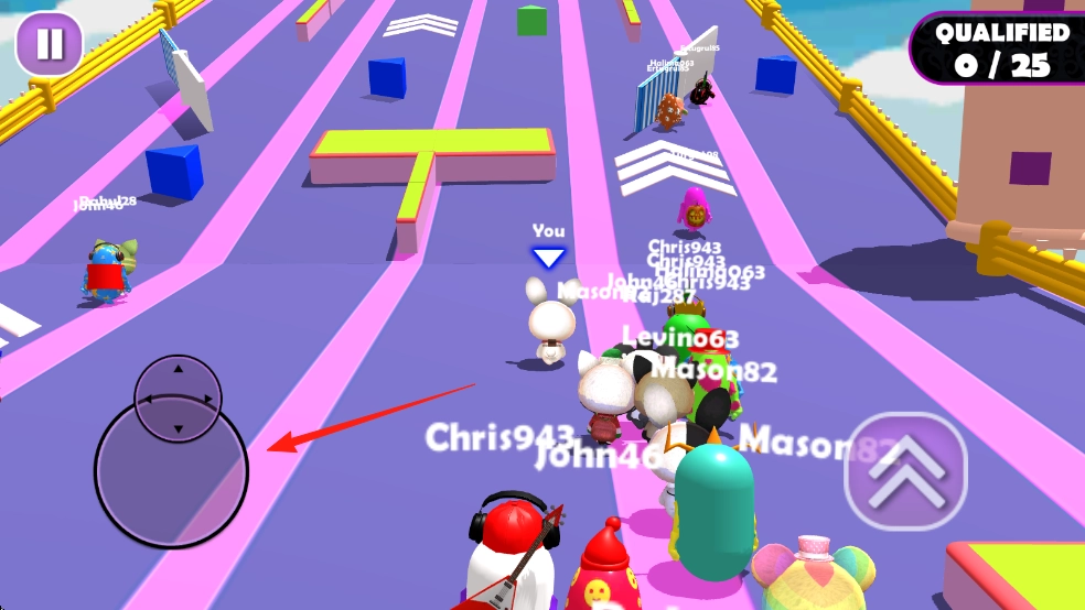 1、通过左侧虚拟摇杆上的红箭头位置来操控标有“You”的角色,使其在粉色跑道上前进,同时避开障碍方块和旋转锤。