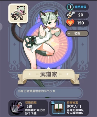 武道家这个角色也很出色,它的奥义技能可以朝着面向的方向发射多枚飞镖,而且初始秘宝能永久提升自身10%的移动速度,同时降低敌人10%的移速。这个设定能让玩家有更充足的时间去获取更多资源奖励,还能更好地躲避敌人的伤害。
