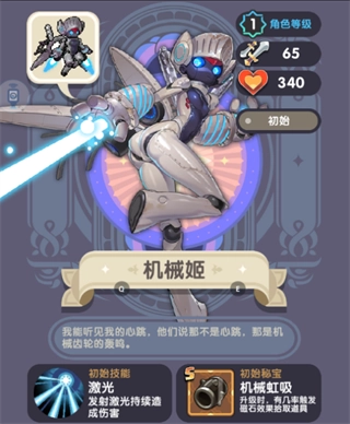 机械姬算是相当强力的职业,不管是刚入坑的新手玩家,还是不怎么氪金的平民玩家,优先选机械姬都挺合适。它的奥义技能是发射激光,能对敌人造成持续伤害,属于比较强力的技能;而且初始秘宝是S级的,能触发磁石效果来吸取道具,也是个非常实用的技能。