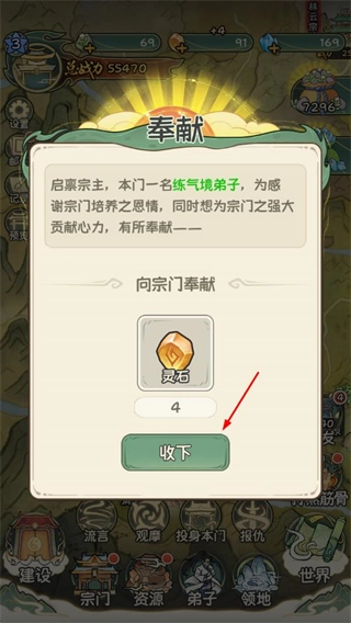 4、决定是否接纳拜入本门的弟子,可消耗资源进行收纳,以此增加弟子数量并提升宗门战力;若资源不足,则可选择拒绝。