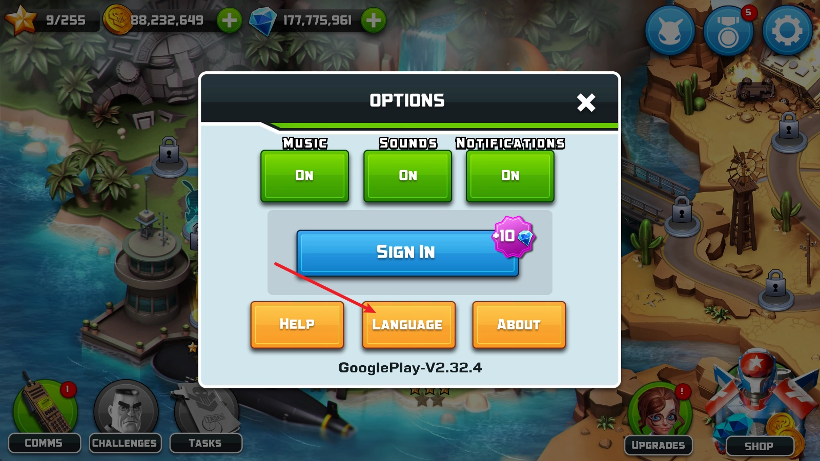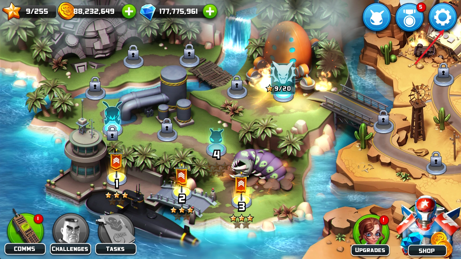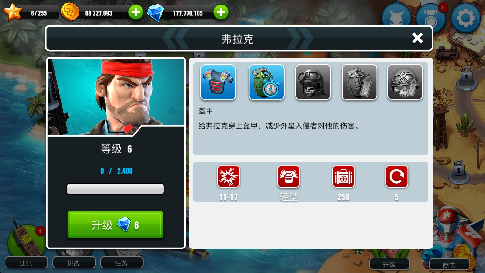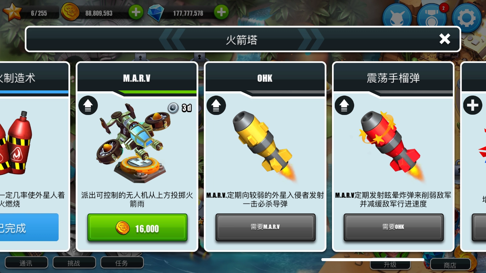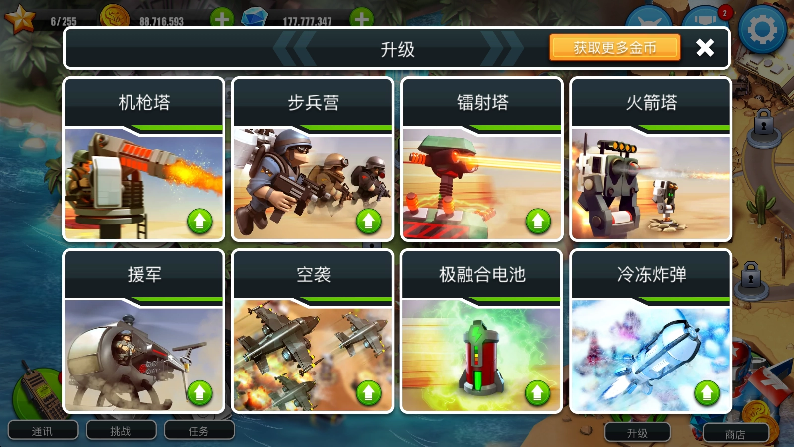 1、在主界面点击右下角的“升级”按钮,即可在此处挑选各类防御塔或支援道具来进行强化操作。