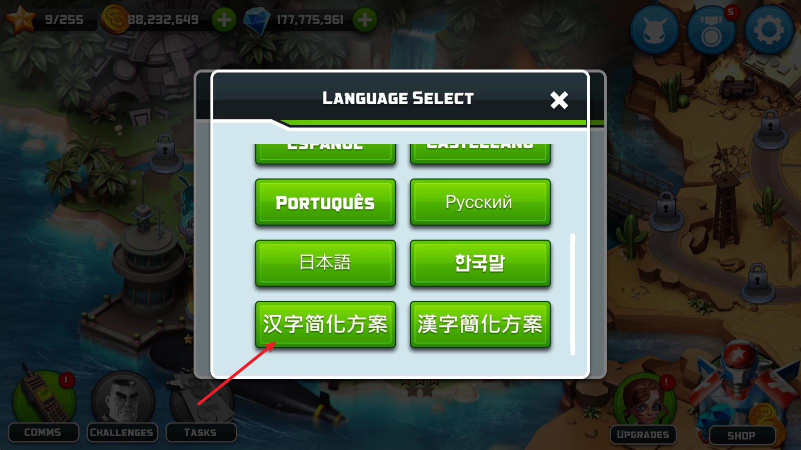 3. 然后滑动到页面底部,找到“汉字”这一选项,点击确认之后,重启游戏就能完成切换了。