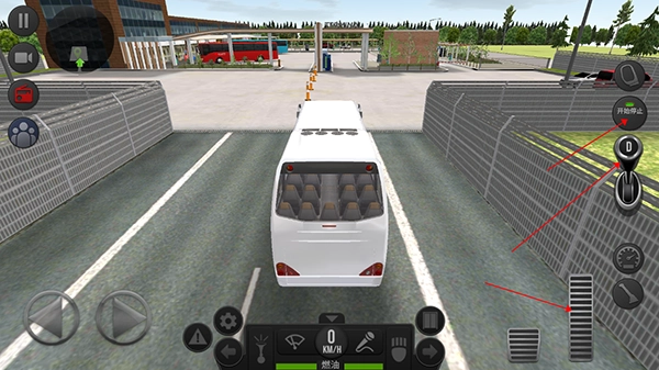 进入游戏后,我们需要驾驶公交车,通过点击图中所示的启动停止键、换挡杆和加速按钮来启动公交车。