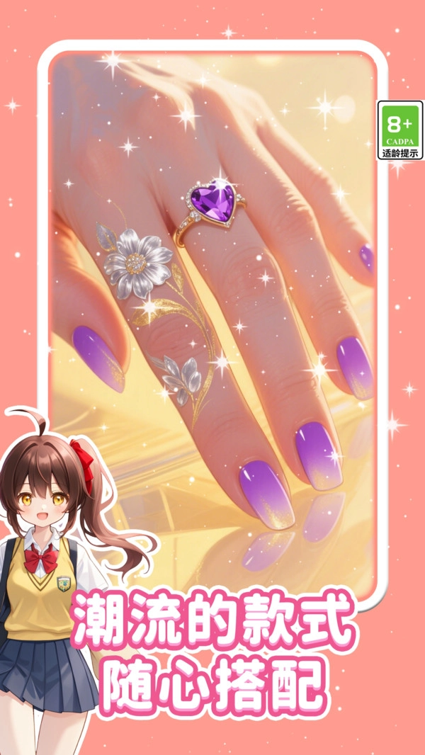 2、需根据不同场景需求如婚礼、万圣节、商务场合搭配对应风格美甲,完成后可获得时尚评分与稀有奖励。