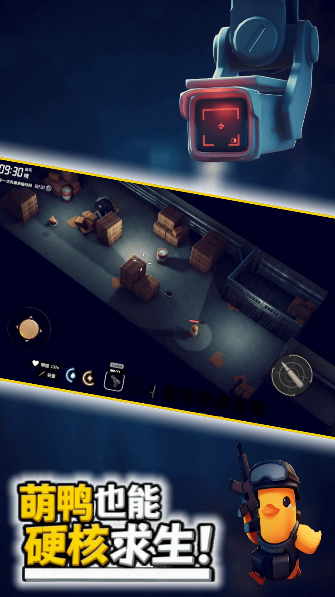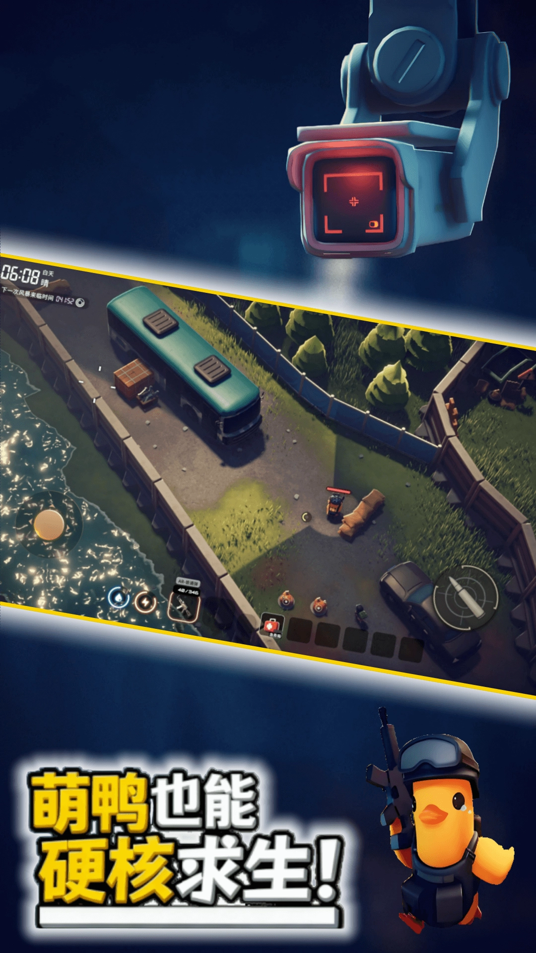 1、采用卡通画风但生存玩法硬核,战术鸭造型又猛又逗,蛋形星球充满未知危险。