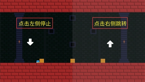 点击屏幕两侧可操控角色完成暂停或跳跃动作,需注意躲避尖刺、深沟、火球之类的危险障碍。